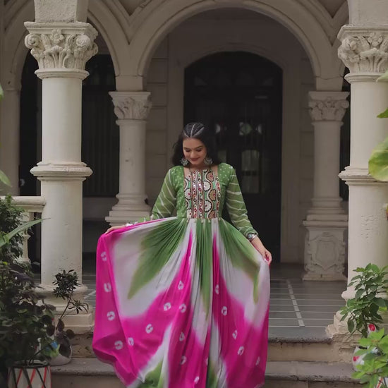 Crafted in Faux Georgette Bandhej Print with exquisite Gamthi Embroidery and sparkling Mirror Work, this gown is the perfect blend of tradition and elegance.