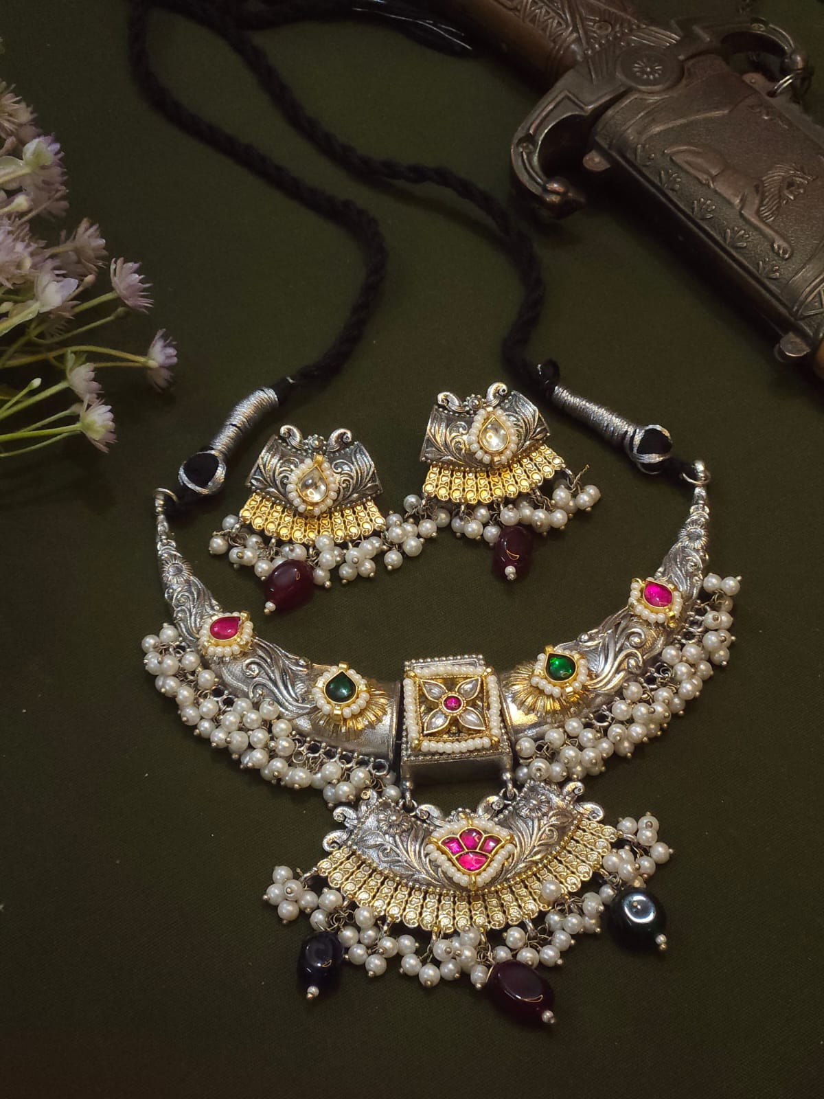 Grace your neckline with the elegance of tradition and the charm of modern design. This dual tone hasli necklace is a timeless piece that blends the richness of gold and silver tones, creating a regal yet contemporary appeal.